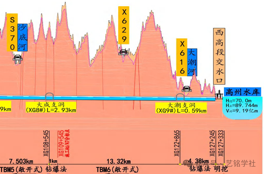 E.鉆爆段圍巖施工流程:開挖→噴混凝土→打設錨桿→掛網(wǎng)→架設鋼拱架→噴混凝土,如此循環(huán)掘進。